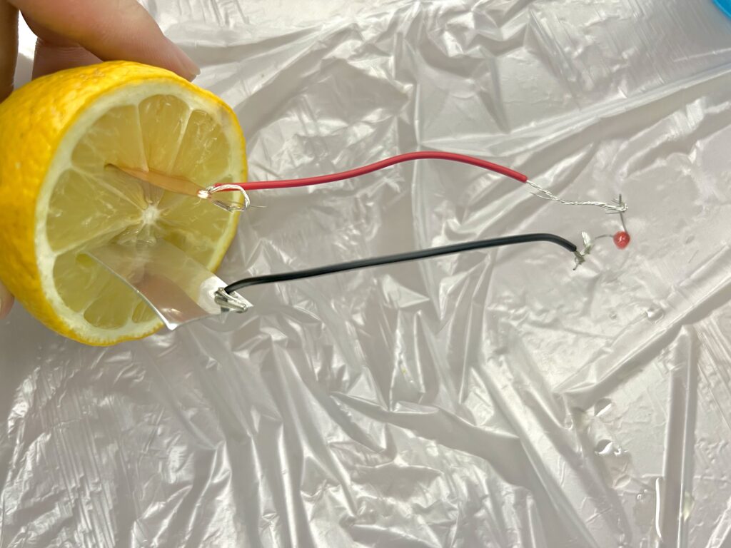 レモンにアルミと銅を刺すだけで、なんと電池になるらしい…!のです。