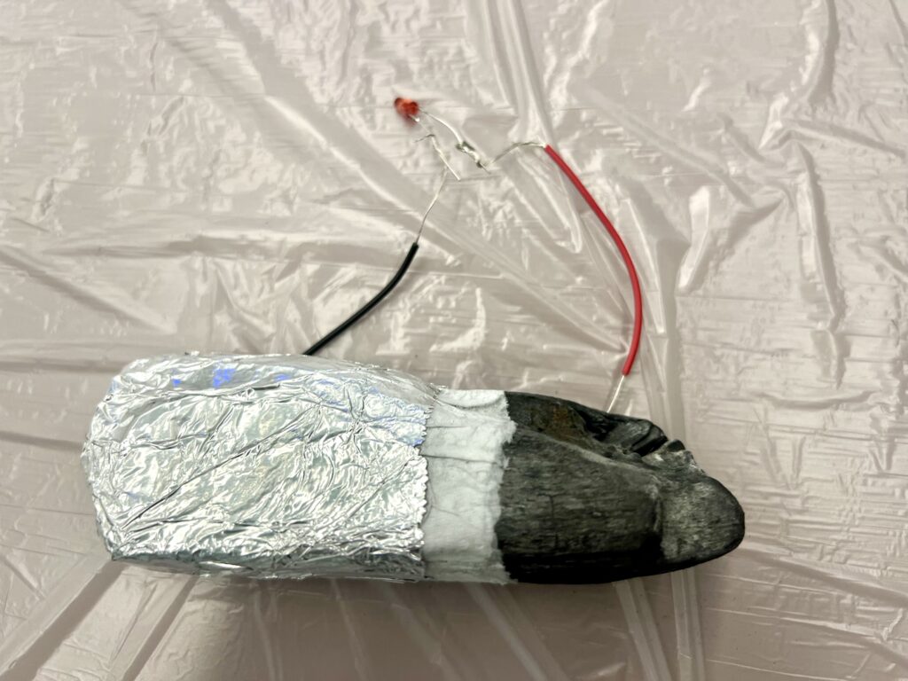すると、炭が+極、アルミが-極になります。