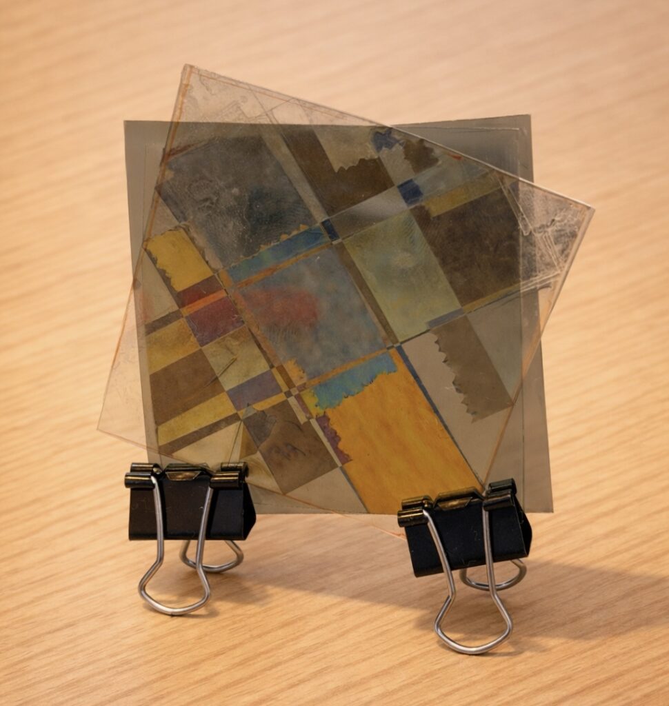 この仕組みにより、テープの重なりや向きに応じて、鮮やかな色彩がステンドグラスのように浮かび上がるのです。