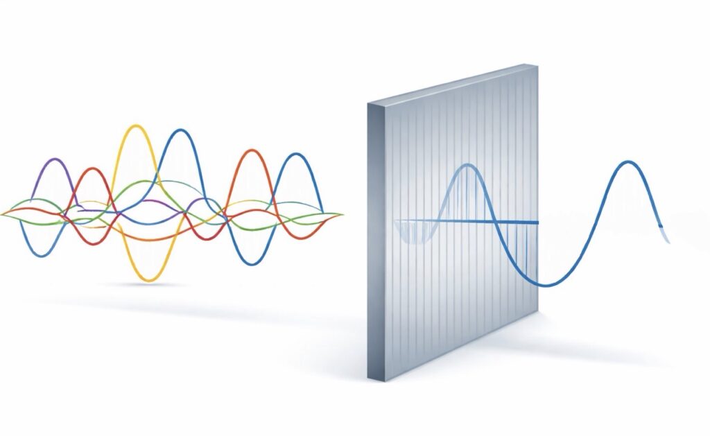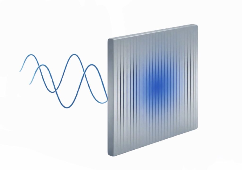 偏光板には、目に見えないくらい細かくて、決まった向きの「すき間」があります。あちこちにゆれていた光も、この板を通ると、すき間と同じ向きのゆれ方だけしか通れなくなります。この「ずれ」